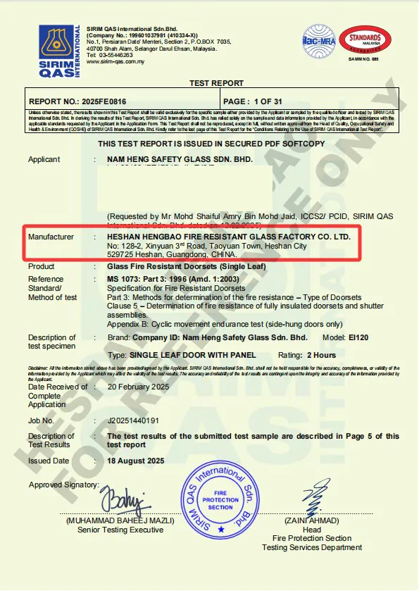 喜讯:恒保与马来西亚南兴玻璃集团共同研究开发EI60和EI120玻璃防火门带间墙系统,并于马来西亚科技创新与产业研究院(SIRIM Berhad)顺利通过SIRIM认证。至此,恒保成为第一个EI120玻璃防火门带间墙系统产品通过SIRIM认证的公司。恒保和南兴玻璃集团共创辉煌,迎来新的里程碑!