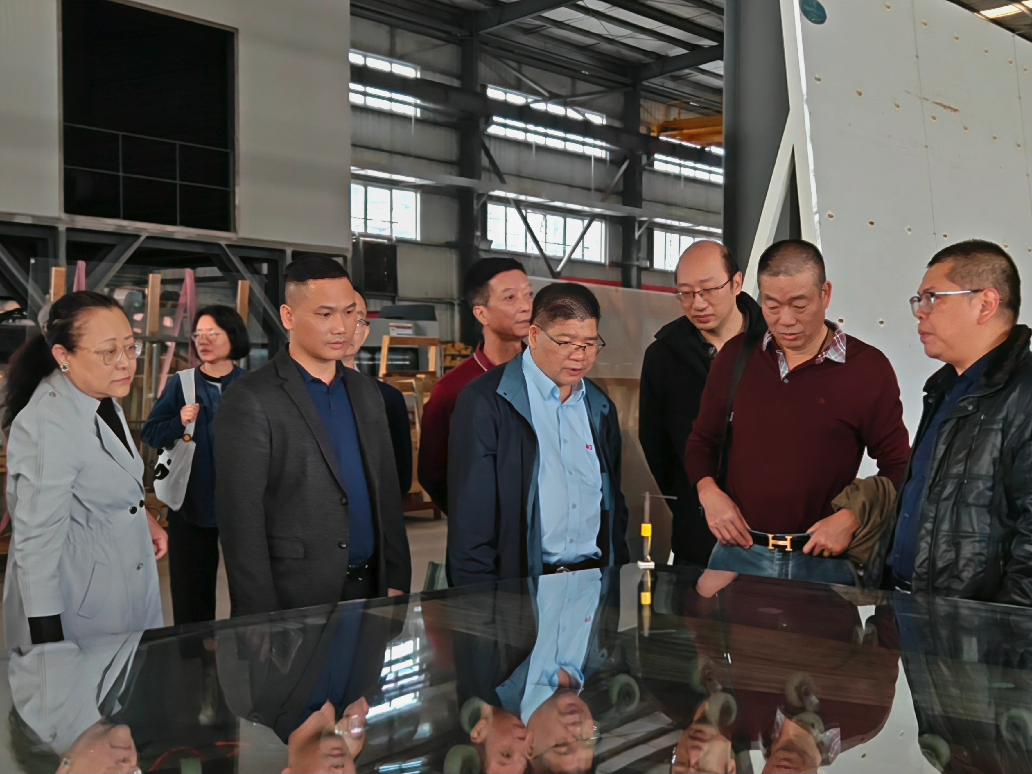 在董事长与业务经理的引导下,考察团移步至公司自动化生产车间。业务经理向代表们系统讲解了防火玻璃从原片到成品的完整工艺流程,介绍了智能化生产设备在提升产品精度与稳定性方面的作用。