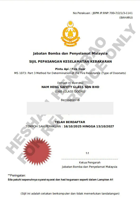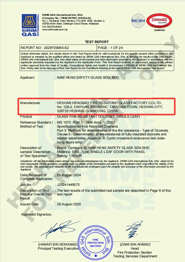 喜讯:恒保与马来西亚南兴玻璃集团共同研究开发EI60和EI120玻璃防火门带间墙系统,并于马来西亚科技创新与产业研究院(SIRIM Berhad)顺利通过SIRIM认证。至此,恒保成为第一个EI120玻璃防火门带间墙系统产品通过SIRIM认证的公司。恒保和南兴玻璃集团共创辉煌,迎来新的里程碑!
